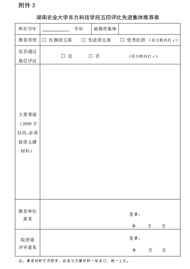 (3)学部团总支向学院团委提交《湖南农业大学东方科技 学院五四评比先进集体推荐表》(附件 3)及相关支撑材料;