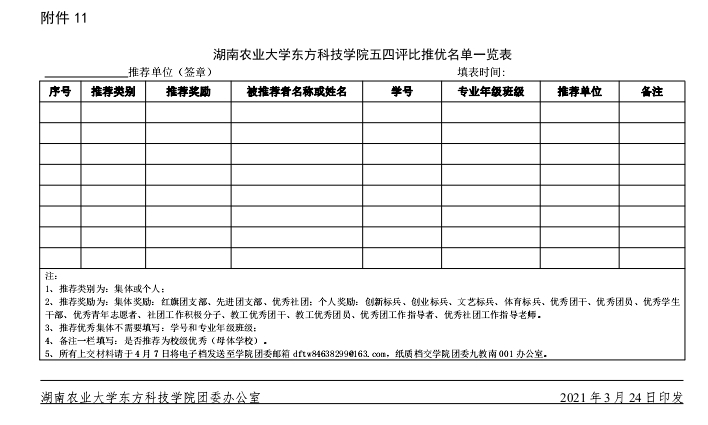 3.凡向学院团委报送推荐材料,必须填写好“湖南农业大学 东方科技学院五四评比推优名单一览表”(附件 11),并上交 电子稿和纸质稿(组织负责人签字)。