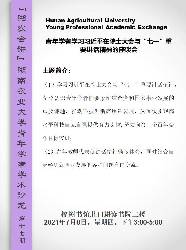 湖南农业大学青年学者学术沙龙第十七期--青年学者学习习近平在院士大会与“七一”重要讲话精神的座谈会