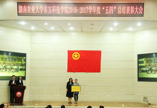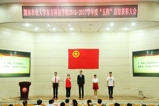 本网讯(团委 黄月飞)在中国共产主义青年团成立95周年,“五四”运动98周年之际,5月4日下午,学院2016—2017学年度“五四”总结表彰大会在图书馆大成厅隆重举行。院领导朱翠英、周其林、邵华、肖化柱、刘湘辉出席,学院各职能部门及学部负责人、全体辅导员老师、获奖集体和个人代表、团员青年代表参加了大会。
