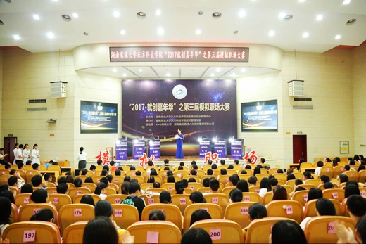 本网讯(招生就业创业指导中心 杨日映)6月8日晚,学院“2017·就创嘉年华”之第三届模拟职场大赛在图书馆大成厅顺利举办。本次比赛由学院招生就业创业指导中心主办、经济管理学部承办,湖南人民广播电台主持人王佳主持。学院副院长刘湘辉、招生就业创业指导中心主任黄正军、教务部主任魏坚、部分教师以及300多名学生观看了此次比赛。