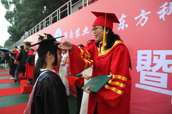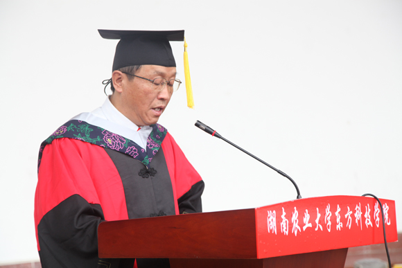 本网讯(学工部 言 勇)6月15日上午,湖南农业大学东方科技学院2017届学生毕业典礼暨学士学位授予仪式在东田径场隆重举行。出席典礼的领导和嘉宾有校党委委员、副校长、学院董事长易自力,全体学院领导,学院学位评定委员会部分委员,学院各职能部门负责人,教师代表及全体辅导员。学院千余名毕业生及家长代表参加了典礼。毕业典礼由学院党委副书记兼副院长邵华主持。